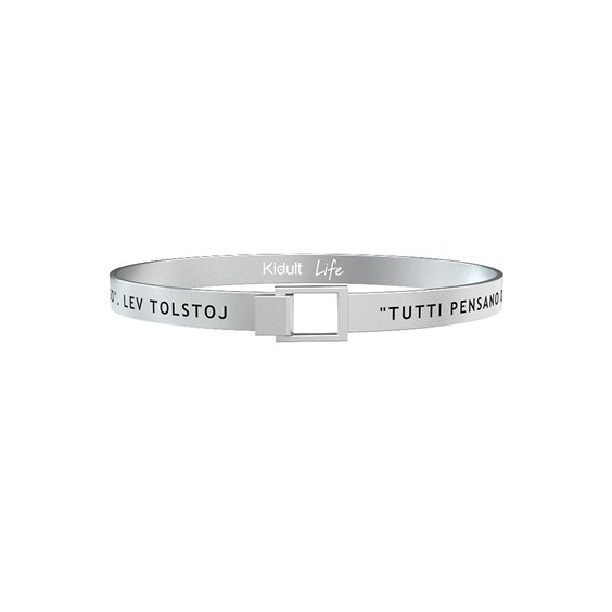 Bracciale rigido Kidult acciaio anallergico 316L con dicitura: “TUTTI PENSANO DI CAMBIARE IL MONDO, MA NESSUNO PENSA A CAMBIARE SE STESSO”- Lev Tolstoj- Dimensioni 5.5 x 6.5 cm.