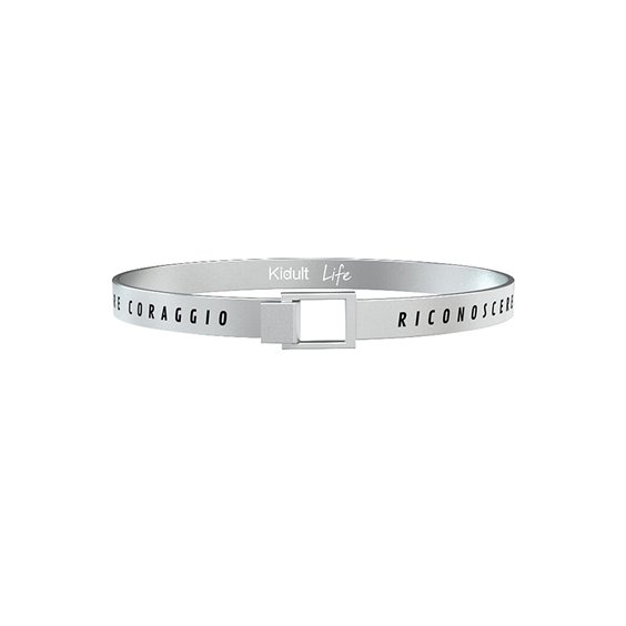 Bracciale Kidult Rigido, collezione Philosophy, in acciaio 316L lucido e satinato. Incisione: 'RICONOSCERE DI AVERE PAURA E' IL PRIMO PASSO PER TROVARE CORAGGIO'. Bracciale ovale per calzare meglio al polso, diametro 5.5 / 6 cm.