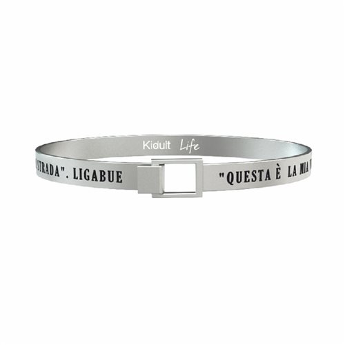 Bracciale bangle in acciaio con scritta “Questa è la mia vita, se ho bisogno te lo dico, sono io che guido, io che vado fuori strada”. Ligabue, misura L.