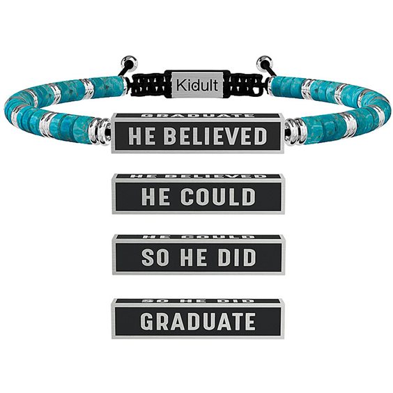 Bracciale Da Uomo Di Kidult Della Collezione Special Moments. Bracciale Con Anelli In Turchese E Piastra Rettangolare In Acciaio Di Colore Nero... La Frase Incisa È: Congratulazioni Per Il Traguardo Raggiunto. Ora È Il Momento Di Partire Alla Conquista Del Futuro, Per Realizzare I Tuoi Progetti Più Grandi.. Materiale: Acciaio 316L Con Pvd Nero, Turchese, Nylon. Gioiello Con Chiusura Con Cordino. Misura Regolabile, Diametro Da 6 A 8 Cm. La Referenza È 731781