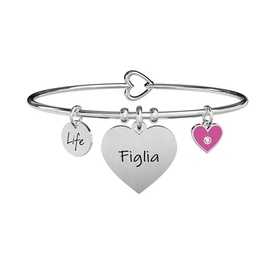 Descrizione Domande e Risposte Reso e Spedizione Bracciale da Donna Kidult rigido Cuore | Figlia in acciaio. Questo bracciale fa parte della collezione Family Bracciale realizzato in acciaio 316L ipoallergenico Ciondolo a cuore con incisione impreziosito da cuori smaltati Diametro massimo 6.5 cm, adatto a polsi di circonferenza fino a 20 cm Chiusura apribile per un inserimento più pratico Lasciati trasportare dai colori, dalle frasi e dai simpatici ciondoli dei gioielli Kidult e rivivi le emozioni del passato o lasciati ispirare e realizza i tuoi sogni. I bracciali Kidult nascono con l’intenzione di raccontare una storia: la tua. “Una figlia è qualcuno con cui ridi, sogni e ami con tutto il tuo cuore”