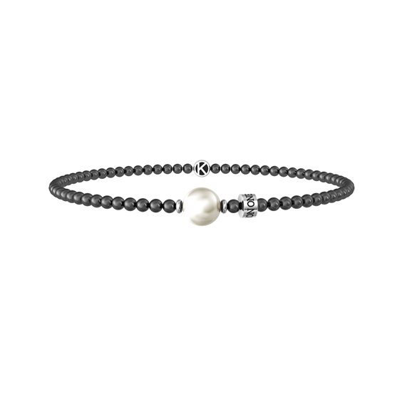 Bracciale elastico in acciaio 316L, circonferenza 18.5 cm, con sfere in PVD gunmetal e perla coltivata. Scritta: ONE IN A MILLION. Dimensioni: sfere Ø 3 mm, perla Ø 7.5-8 mm