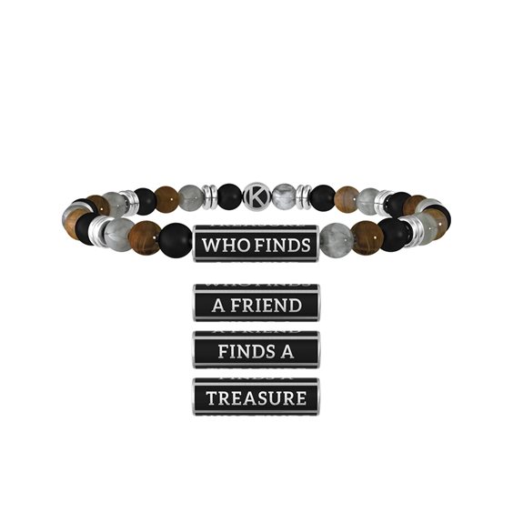 Bracciale elastico in acciaio 316L, circonferenza 20 cm, con elemento satinato in PVD nero, pietre naturali multicolor. Scritta: WHO FINDS A FRIEND FINDS A TREASURE. Dimensioni: pietre Ø 6 mm.