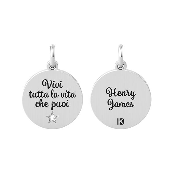 Ciondolo in acciaio 316L satinato con cristalli bianchi. Scritta: "Vivi tutta la... puoi" - H. James. Dimensioni: ciondolo Ø 15 mm, cristalli Ø 1.5 mm