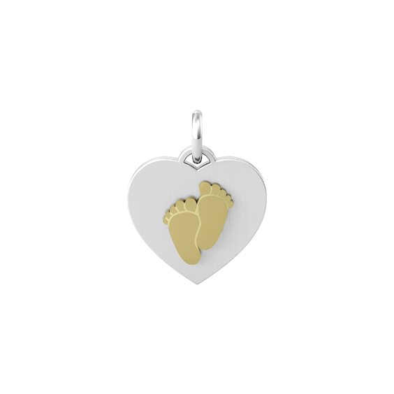 Ciondolo in acciaio 316L satinato taglio cuore con elemento piedini PVD giallo lucido. Dimensioni: ciondolo Ø 15x15 mm, piedi 7.5x9 mm
