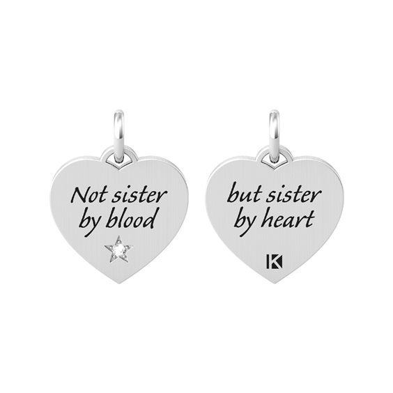 Ciondolo in acciaio 316L satinato taglio cuore con cristallo bianco. Scritta: Not sister by... heart. Dimensioni: ciondolo Ø 15x15.5 mm, cristallo Ø 1.5 mm