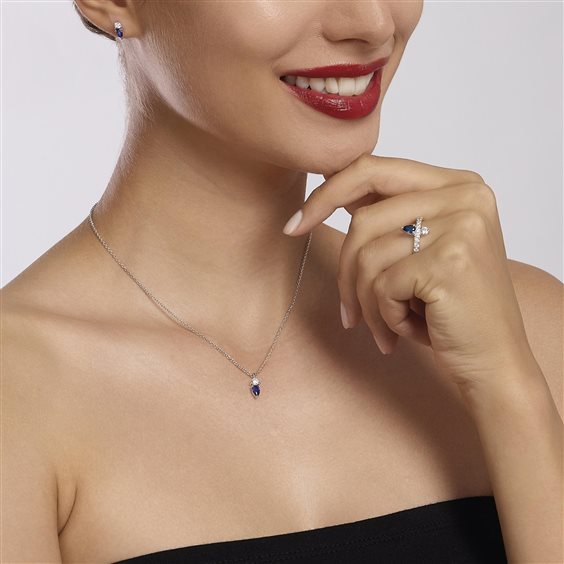 Anello in argento 925/°°° rodiato con zaffiro sintetico taglio goccia 6x4 mm e zirconi bianchi Ø 3.5 e 2 mm, misura 11