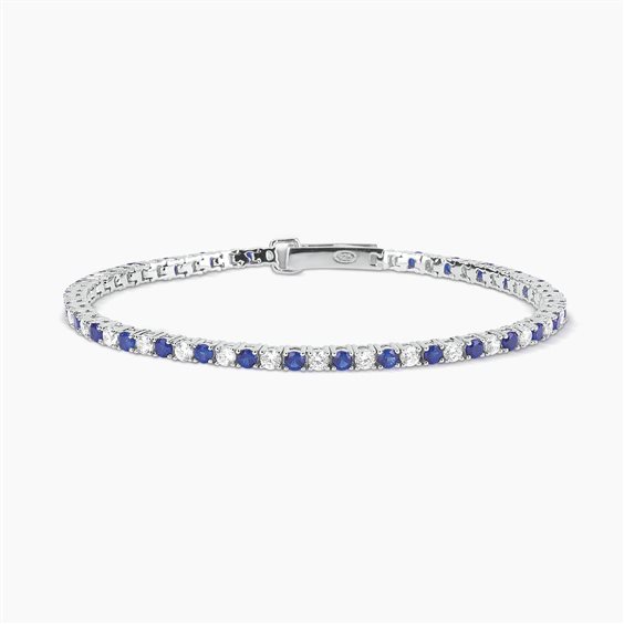 Bracciale tennis in argento 925/°°° rodiato con zaffiri sintetici Ø 2.5 mm e zirconi Ø 2.5 mm, lunghezza 17 cm
