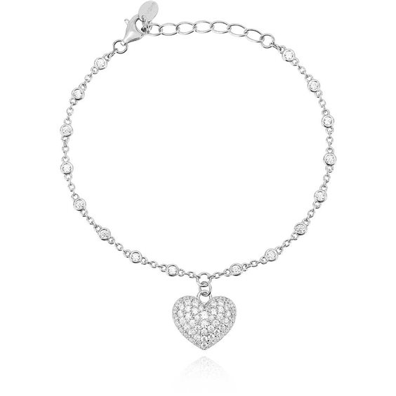 Bracciale rolò in argento con punti luce in zircone e ciondolo a cuore in pavé di zirconi. • Incastonatura degli zirconi sulla catena a castone • Dimensione del cuore: 14,5 x 12,5 mm • Diametro degli zirconi: 2 mm, 1,75 mm e 1,5 mm • Chiusura con moschettone • Misura regolabile, lunghezza da 16 a 19 cm • Materiale: Argento 925, Zirconi