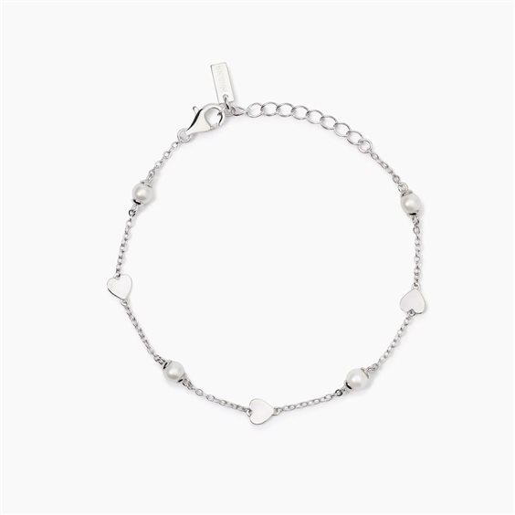 Bracciale in argento 925/°°° rodiato con catena forzatina 1.5 mm, elementi cuore 5x5.5 mm e perle conchiglia Ø 4 mm, lunghezza regolabile da 16 a 19 cm