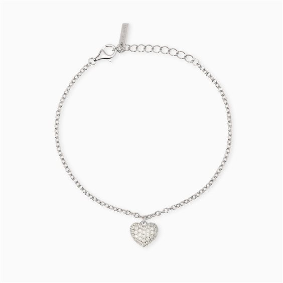 Bracciale regolabile con ciondolo cuore Bracciale in argento con catena rolò e ciondolo cuore in pavè di zirconi bianchi. • Dimensione catena: 2 mm • Dimensione ciondolo cuore: 10x10 mm • Diametro zirconi: 1,25 mm • Misura regolabile dalla 16 alla 19 cm • Materiale: Argento rodiato 925, Zirconi