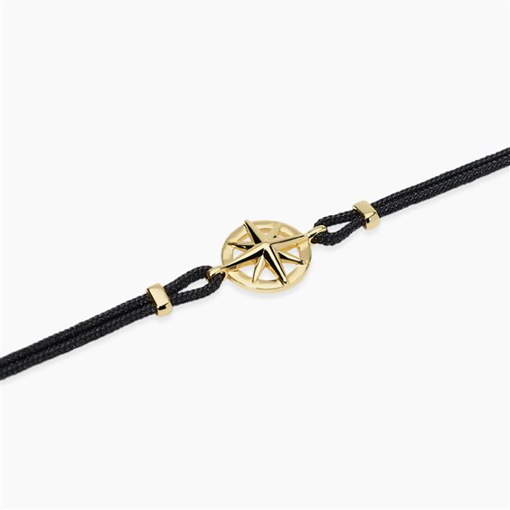 Bracciale in cordoncino nero e argento 925 placcato oro giallo 18Kt. Rosa dei venti centrale cm 1. Chiusura a moschettone. Misura regolabile da cm 18,5 a cm 20,5.