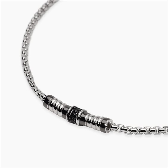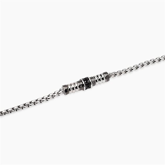 Bracciale in argento 925 rodiato e zirconi neri. Catena maglia veneta con inserti bruniti e zirconi neri. Chiusura a moschettone. Misura regolabile da cm 18,5 a cm 20,5.