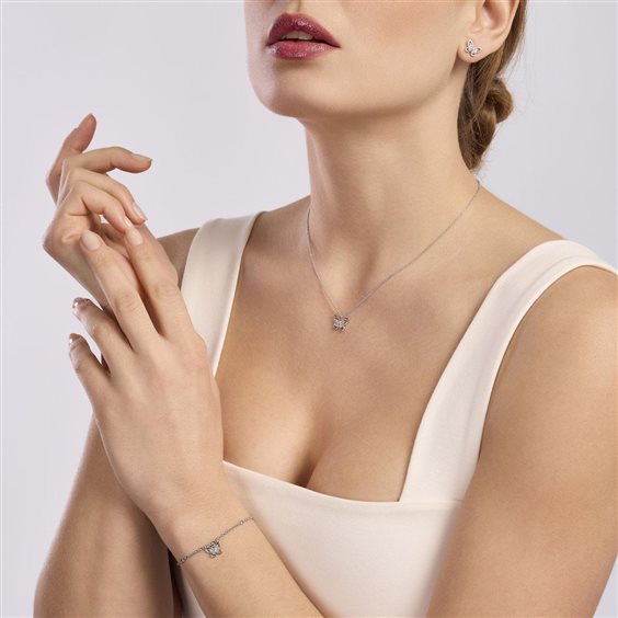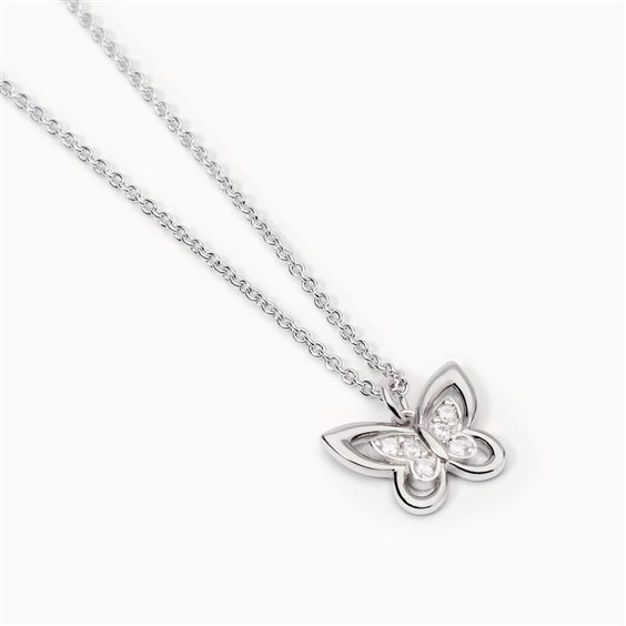 Girocollo in argento 925/ººº rodiato con catena forzatina 1 mm, pendente farfalla 12.5x9.5 mm e zirconi Ø 1.5 mm, lunghezza regolabile da 39 a 43 cm
