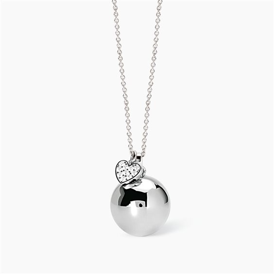 Collana in argento 925/ººº rodiato con catena rolò 1.5 mm, pendente chiama angeli in ottone rivestito in argento 925/ººº Ø 18 mm e cuore 8.5x8 mm con zirconi Ø 1.75 mm, lunghezza 85 cm