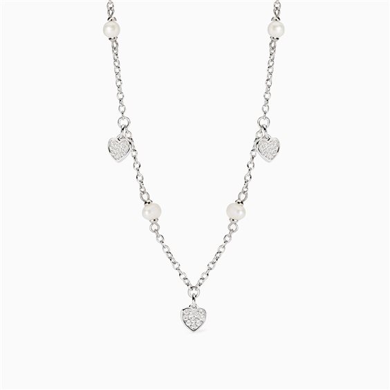 Girocollo regolabile da donna in argento rodiato con catena rolò. Perle coltivate e ciondoli cuore con zirconi. • Dimensione catena: 1,5 mm • Dimensione pendenti cuore: 5x5 mm • Diametro perle coltivate: 3-3,5 mm • Diametro zirconi: 1 mm • Lunghezza regolabile da 37 a 41 cm • Materiale: Argento 925, Zirconi
