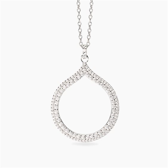 Girocollo in argento con catena rolò con pendente goccia in zirconi bianchi. • Dimensione catena: 1,5 mm • Dimensione pendente cerchio: Ø5,7x1,5 mm • Dimensione pendente goccia: 25,3x29,5 mm • Diametro zirconi: 1 e 1,5 mm • Misura regolabile dalla 40 alla 45 cm • Materiale: Argento rodiato 925, Zirconi