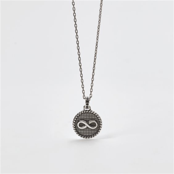 Collana in argento 925/°°° rodiato e finitura brunita con catena forzatina, larghezza 1.50 mm, ciondolo Ø 16 mm con infinito e zirconi neri Ø 1.25 mm, lunghezza 50 cm