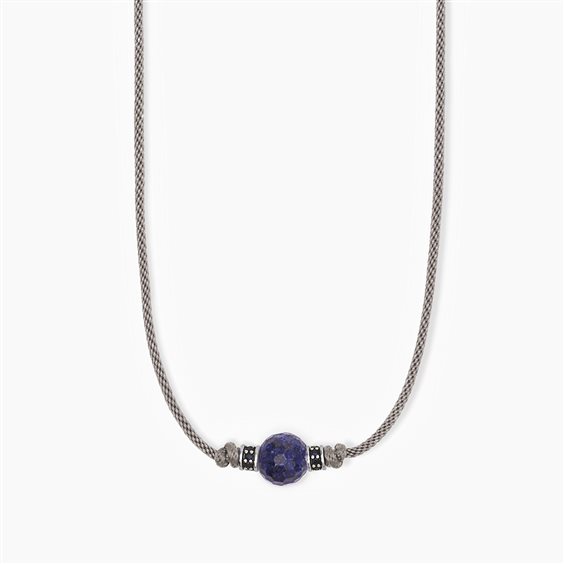 Collana in argento 925/°°° rodiato con cordino grigio, pietra lapis Ø 11-12 mm ed inserti con zirconi blu Ø 1.2 mm, misura regolabile da 38 a 54 cm