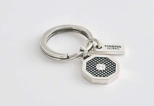 Portachiavi uomo , argento 925 , lunghezza cm 4.5 , ciondolo ottagonale borchiato con zircone bianco. incastonato con griffe. Scatola e garanzia originali.