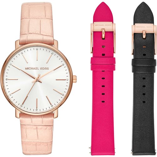 Orologio Set Composta Da Orologio Solo Tempo E 2 Cinturini Da Donna Di Michael Kors Della Collezione Pyper. Modello Con Cassa Rotonda In Acciaio Inossidabile Di Colore Oro Rosa Con Finitura Lucida. Cassa Di Misura 38 Mm E Spessore Di 7 Mm. Ghiera In Acciaio Inossidabile Di Colore Rose Gold Con Finitura Lucida. Il Quadrante È Di Colore Bianco Con Vetro Trasparente. Cinturino In Pelle Di Colore Rosa Con Finitura Lucente E Fibbia Ad Ardiglione. La Distanza Delle Anse È Di 18 Mm. Modello Impreziosito Da Cristalli Sul Quadrante. La Resistenza All'Acqua È Di 5 Atm. Orologio Con Movimento Al Quarzo E 3 Sfere