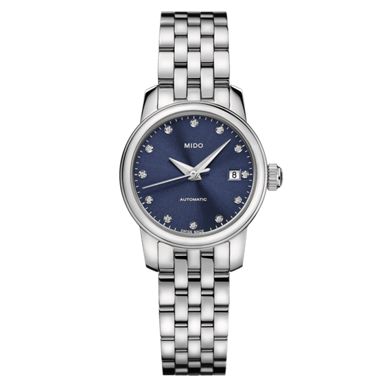 Può sembrare piccolo, ma l'orologio da donna Baroncelli Twenty Five sa come essere al centro dell'attenzione. Tutto è armoniosamente incorporato all'interno della cassa in acciaio lucido, i suoi 25 mm di diametro mostrano linee aggraziate ed equilibrate. Chic senza tempo, questo orologio classico rifiuta di essere limitato dalle mode del momento ed è animato da un movimento automatico arricchito da una spirale Nivachron™. In questa versione il Mido Barocelli donna ha una cassa in acciaio completamente lucidato che misura 25 mm di diametro e uno spessore di 9.1 mm. Il movimento è automatico Mido Calibro 48 (base ETA C26.111) con riserva di carica pari a 48 ore. Il quadrante è blu arricchito con 12 diamanti.