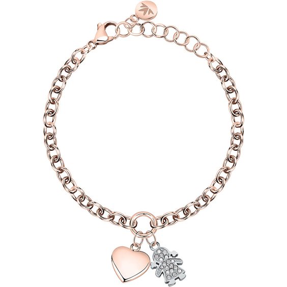 Bracciale Morellato in acciaio PVD oro rosa. Catena maglia rolò con due pendenti, bimba con cristalli e cuore PVD oro rosa. Misura regolabile da cm 16 a cm 19.