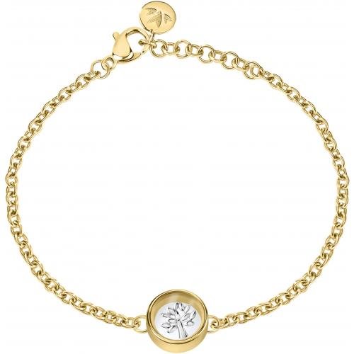 BRACCIALE COLLEZIONE SCRIGNO D'AMORE IN ARGENTO COLORE ORO CON CIONDOLO CENTRALE IN VETRO E ALL'INTERNO CIONDOLO A FORMA DI ALBERO. LUNGHEZZA 15+3 CM