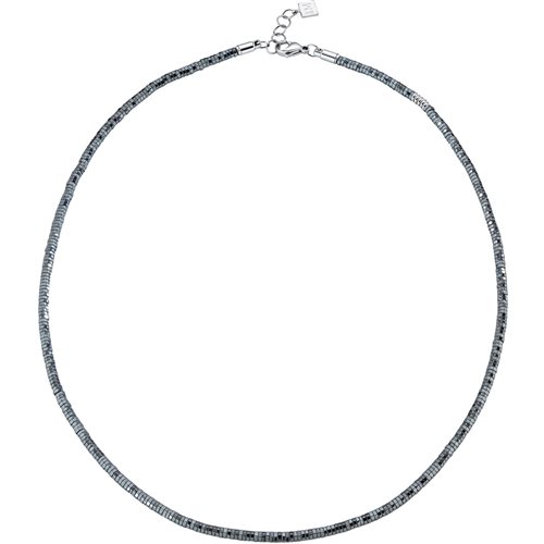 Collana uomo in acciaio 316L , lunghezza cm 50 con messa a misura fino a cm 45 , cavetto in acciaio con inserti in ematite . Immagine indicativa , la confezione può variare in forma e colore.