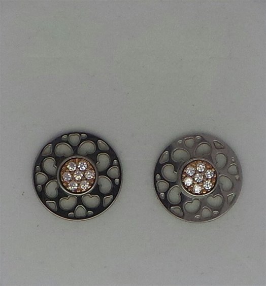 Orecchini a lobo in acciaio con dettagli in argento 925, bagno galvanico di oro rosa 22 KT e Cubic Zirconia. Diametro pendente 1,5 cm. Made in Italy. Collezione Paradiso Eden Edition.