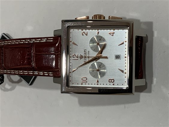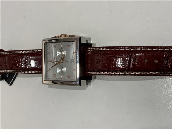 OROLOGIO QUADRATO CRONO DA UOMO,CASSA IN ACCIAO,QUADRANTE GRIGIO CHIARO,DUE CONTATORI,DATARIO A ORE 6,NUMERI COLOR ROSè, E CINTURINO IN PELLE BORDEAUX