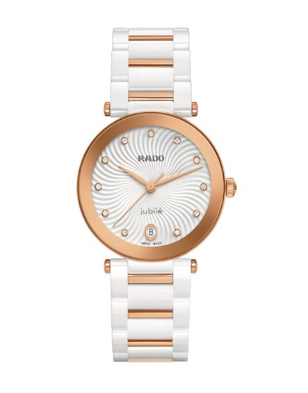 LaCoupole rievoca il fascino intramontabile delle icone del passato, reinterpretato per l’uomo contemporaneo che ama distinguersi. L’eccellenza del design si unisce all’innovazione svizzera in una creazione Rado senza tempo. La cassa monoblocco da 31 mm in ceramica high-tech bianca lucida è sormontata da un cristallo zaffiro bombato, impreziosito da un bordo metallizzato oro rosa. Impermeabile fino a 5 bar (50 metri), garantisce affidabilità e stile in ogni situazione quotidiana. Il design riflette la firma Rado: elegante, armonioso e intramontabile. Sul quadrante argentato, raffinati motivi ondulati laccati danno vita a un sofisticato effetto tridimensionale. 11 diamanti Top Wesselton taglio brillante segnano le ore con raffinata luminosità, mentre il datario a ore 6 aggiunge un tocco funzionale di classe. Il cuore pulsante è il calibro al quarzo R218 a 8 rubini, ottimizzato con PreciDrive™ per una precisione senza pari. Completa il design un bracciale in ceramica high-tech bianca lucida, arricchito da elementi e fibbia con finitura PVD oro rosa, per un equilibrio perfetto. LaCoupole incarna l’eleganza senza tempo: pensato per affascinare e realizzato per resistere al passare degli anni.