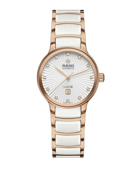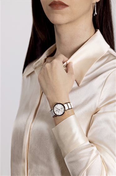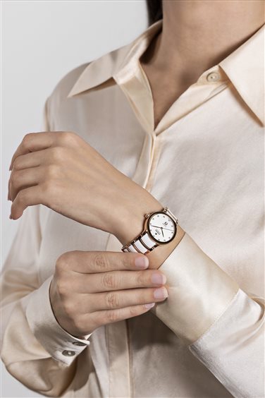Il classico Centrix Automatic Diamonds è stato rielaborato non solo tecnicamente, ma anche esteticamente. Il nuovo modello dispone di un cristallo zaffiro arrotondato che si estende fino al bordo e di una cassa ricurva che si integra con l’estremità del cristallo. Le anse della cassa ridisegnate e il bracciale in acciaio lucido rivestito in PVD color oro rosa con maglie centrali in ceramica hi-tech bianca completano l’estetica rinnovata di questo iconico segnatempo. Il quadrante sfaccettato color argento dispone di uno spettacolare effetto 3D realizzato tramite la stampa di un quadrante sagomato che viene poi riempito di lacca. All’interno, il calibro R582 a tre lancette supera gli standard di precisione nei test da 3 a 5 posizioni e grazie alla spirale antimagnetica Nivachron™ garantisce elevata affidabilità e puntualità. L’orologio è impermeabile fino a 50 m e offre una riserva di carica di 48 ore.