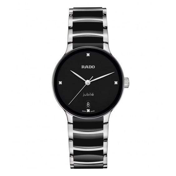 Il classico Centrix Quartz Diamonds è stato rielaborato non solo tecnicamente, ma anche esteticamente. Il nuovo modello dispone di un cristallo zaffiro arrotondato che si estende fino al bordo e di una cassa ricurva che si integra con l’estremità del cristallo. Le anse della cassa ridisegnate e il bracciale in acciaio lucido con maglie centrali in ceramica high-tech nera completano l’estetica rinnovata di questo iconico segnatempo. Il quadrante nero laccato, impreziosito da 4 brillanti e sottolineato dal logo “jubilé” stampato, si abbina perfettamente alle lancette color rodio. Grazie al movimento al quarzo calibro R073 dotato di PreciDrive e HeavyDrive, il segnatempo è dotato di grande precisione e resistenza agli urti. L'orologio è impermeabile fino a 50 m.