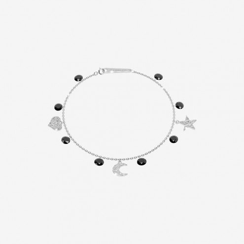 Braccialetto con moschettone Rebecca donna in argento 925 rodiato, con charm cuore, stella e luna diamantati più zirconi neri. Lunghezza 18,5 cm.