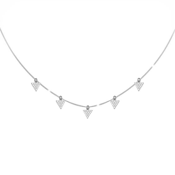 Collana da donna di Rebecca della collezione Diana. Gioiello in argento e triangoli in zirconia cubica. Nella catena è presente un carellino di 7 cm da poter regolare la misura da 38 a 45 Cm.