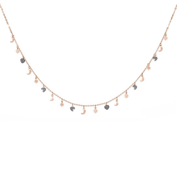 Collana della collezione Jolie in argento 925/°°° laminato oro rosa, con cuoricini rivestiti con sabbia di diamanti.