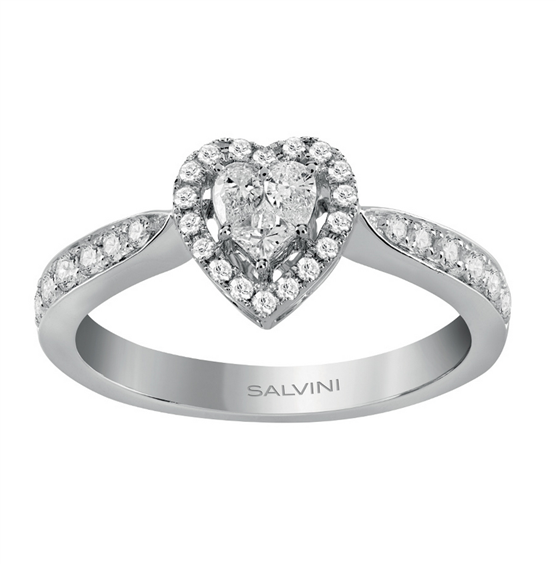 Anello della collezione Magia in oro bianco con diamante centrale a taglio a goccia di caratura 0,20 di colore G e diamanti nel contorno e nel gambo di taglio rotondo di caratura 0.25 di colore GH.