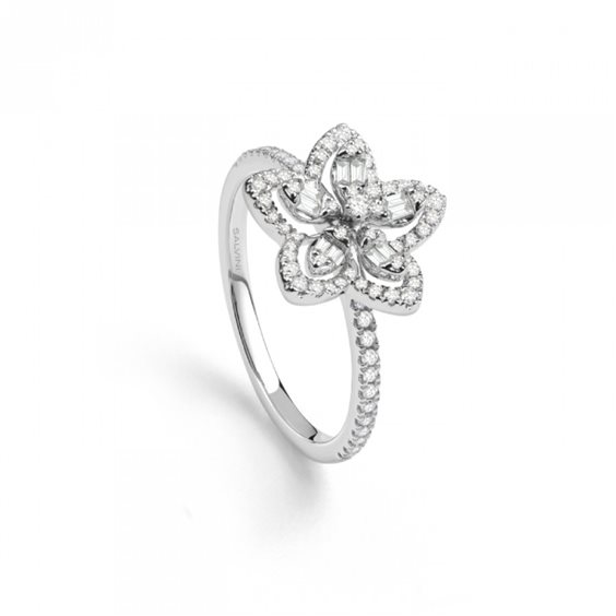 Anello della collezione Magia garden in oro bianco e diamanti a taglio rotondo e baguette di caratura 0,57 di colore GH.