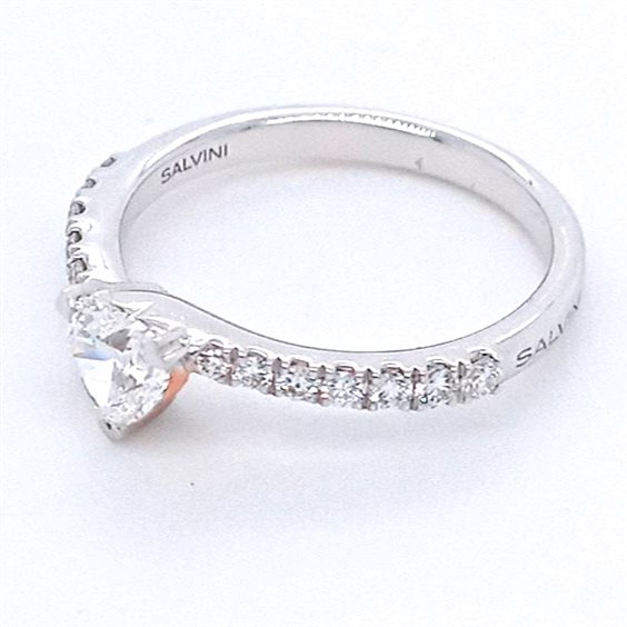 Anello solitario della collezione Battito cuore pavè in oro bianco con diamante centrale con taglio a cuore di caratura 0,30. Caratura totale, compresi i diamanti anche nel gambo: 0,51 Ente certificato: GIA.