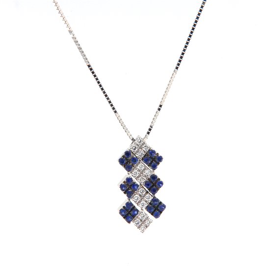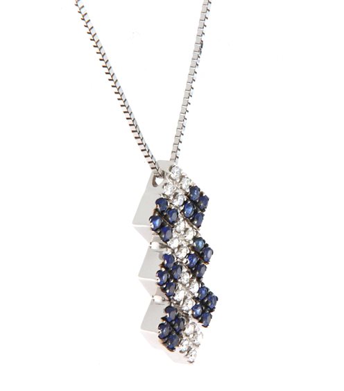 Collana con centrale a formato da tre rombi di zaffiri e diamanti ct 0,28