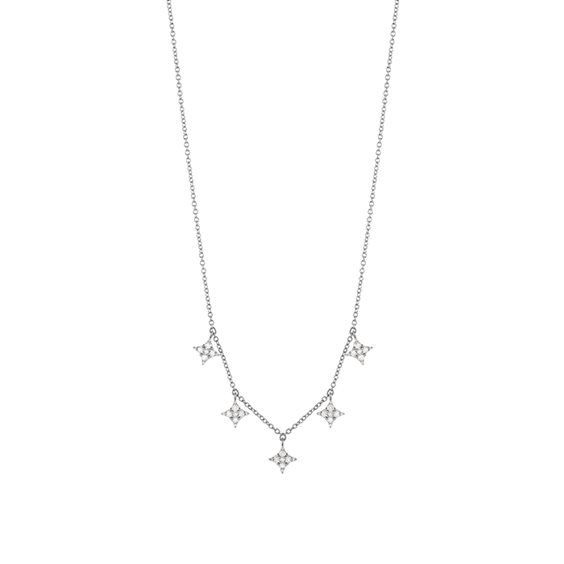 Collana donna in oro bianco 18kt con cinque pendenti di diamanti a forma di stella luminosa.