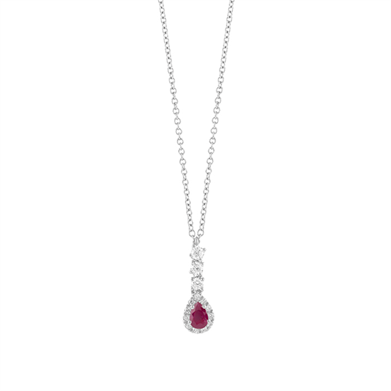 Collana 42cm della collezione Gocce in oro bianco con rubino taglio a goccia di caratura 0.40 e diamanti a taglio rotondo di caratura 0.26 di colore G.