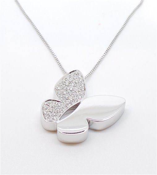 Collier in oro bianco 18kt con pendente farfalla, pavè di diamanti taglio brillante di ct.0,51 complessivi. Dimensioni pendente cm2,7X2,7. Scatola e garanzia originalità del prodotto. Un must della Maison Salvini, un' icona di stile dell' alta gioielleria Made in Italy: questo è la collezione di gioielli Farfalle Textures