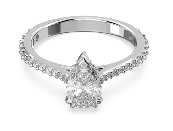 Indossato da solo o abbinato ad altri gioielli, l’anello cocktail Millenia attirerà sicuramente l'attenzione. Una singola pietra taglio Pear incastonata su una fascia placcata in rodio impreziosita da pavé per uno stile disinvolto e chic.
