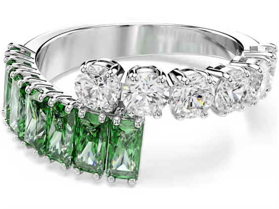Questo ipnotico anello a fascia presenta una collisione di colori e forme. La fascia sovrapposta è placcata rodio con Swarovski Zirconia trasparenti e verdi con tagli Round e Baguette. Una scelta vivace che si abbina splendidamente al bangle e agli orecchini coordinati. Articolo nr.: 5722458 Collezione: Matrix Materiale: Placcatura rodio, Zirconia Colore: Verde