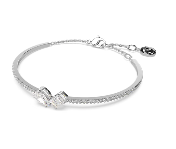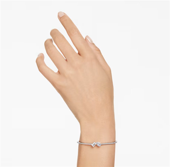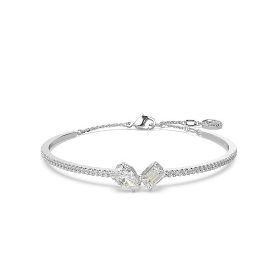 Avvolgi il tuo polso nella sfavillante eleganza dello stile Mesmera. Questo bracciale rigido placcato rodio presenta un pavé di cristalli su ogni lato, abbinati a due Swarovski Zirconia centrali dal taglio Pear e Octagon Step. Un duo radioso che cattura la luce da ogni angolo. Il bracciale, che presenta un allungamento pendente, è un raffinato gioiello adatto alle occasioni commemorative.