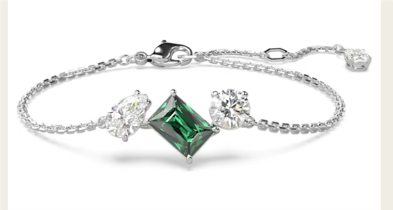 Accentuato da un vivace tocco di colore, questo bracciale Mesmera è qui per stupire. Questo design placcato rodio è montato su una delicata catena con un allungamento pendente e presenta un trio di Swarovski Zirconia di diverse forme montati a griffe, che comprendono anche una pietra centrale verde dal taglio Octagon-step. Un audace mix di tagli per un regalo meraviglioso. Immagini a scopo illustrativo.