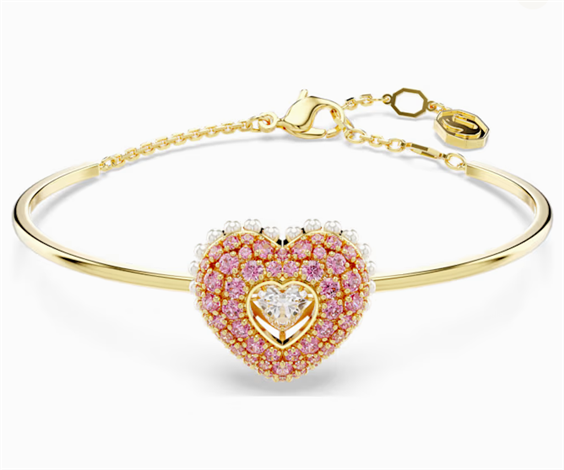 Questo bangle Hyperbola color oro esprimerà tutto il tuo amore esibendo una combinazione di colori e tagli. Il motivo a forma di cuore è stato realizzato con un design tridimensionale per il massimo volume e include una serie di piccole Crystal Pearls bianche attorno al bordo. Per enfatizzarne l’effetto a cupola, il cuore è impreziosito da Swarovski Zirconia rotondi rosa, incastonati utilizzando la brillante tecnica chatonnage. Al suo centro, una pietra danzante, anch’essa a forma di cuore, cattura i raggi di luce da ogni angolazione. Sceglilo come idea regalo speciale per sorprendere una persona che ami. Articolo nr.: 5687258 Collezione: Hyperbola Lunghezza: 16.5 cm Diametri interni: 5.9 x 4 cm Dimensione decorazione: 1.8 x 1.9 cm Distanza apertura: 4.5 cm Materiale: Cristalli, Placcato color oro, Perla di cristallo, Zirconia Colore: Rosa Tipo di fermaglio: Moschettone