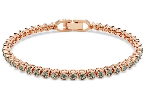 ’’Un classico bracciale tennis con una luce che parla da sé. Questo delicato filo di cristalli neri con montatura a castone su un bracciale tennis placcato in tonalità oro rosa è elegante e minimalista, ma allo stesso tempo rappresenta un audace statement al polso. Il design raffinato presenta un comodo fermaglio di sicurezza ed è dotato di un extender. Indossalo per accentuare il tuo stile in qualsiasi momento del giorno o della sera.